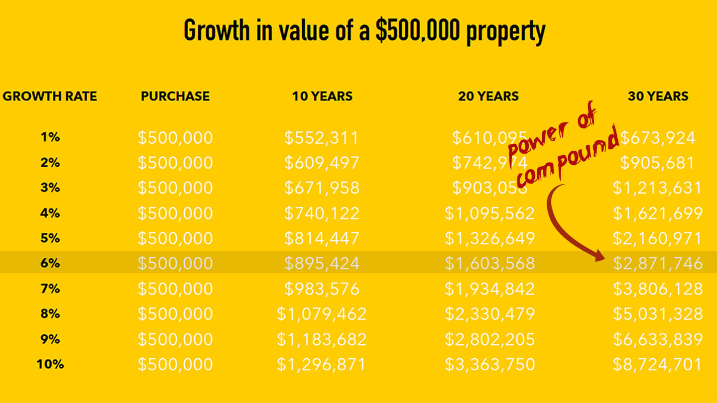 Look at how 6% compound growth , balloons the value of a $500,000 property. Over the last 25 years the Australian National Average has been 6.8% pa. Australia's national average property value has risen by 412% over the past 25 years (since 1993)